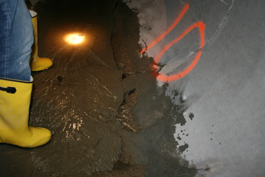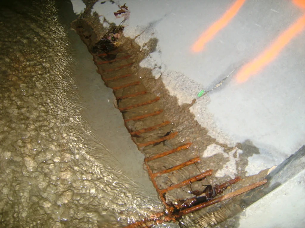Cracking along the parts of the culvert were popping up, along with exposed re-bar inside the pipe.  The joints started to separate, exposing the gaskets.  On the southbound pipe the water on the inlet side was actually flowing under the first two sections of the RCP pipes.  And, in one part of the northbound pipe, the RCP had collapsed over eight inches.  At this rate, the culvert was due to collapse at any moment.